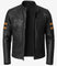 This black leather biker jacket combines classic moto styling with modern detailing. Made from real lambskin leather, it features a snap-tab stand collar, quilted shoulder and elbow panels, and four zippered pockets for convenience. Finished with bold tan racing stripes on each sleeve, it’s built for both style and road-ready attitude.